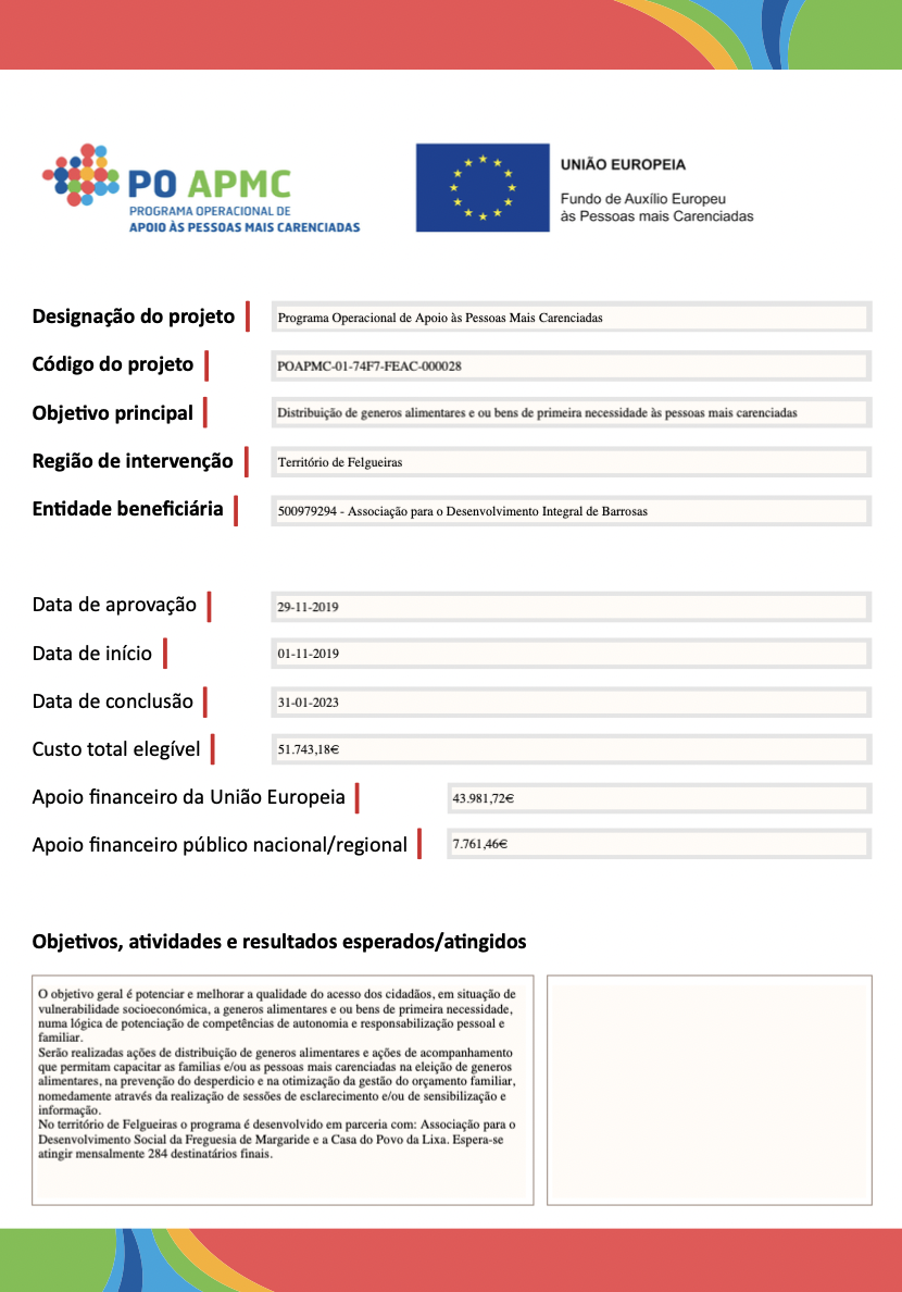No território de Felgueiras, pretende-se apoiar mensalmente 284 destinatários finais, em parceria pela Associação para o Desenvolvimento Integral de Barrosas (entidade coordenadora e mediadora), com a Associação para o Desenvolvimento Social da Freguesia de Margaride (entidade mediadora) e a Casa do Povo da Lixa (entidade mediadora).